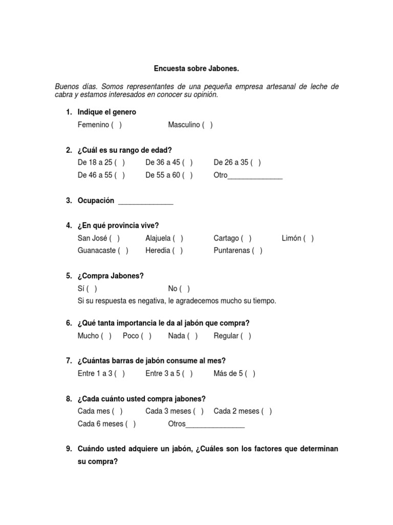 Encuestas sobre jabones. 7 páginas • 4099 visualizaciones. ¡explore plantillas de formularios de publicidad para ayudarle a recibir de forma eficiente nuevas consultas de clientes. La encuesta no llevara más de 3 minutos.