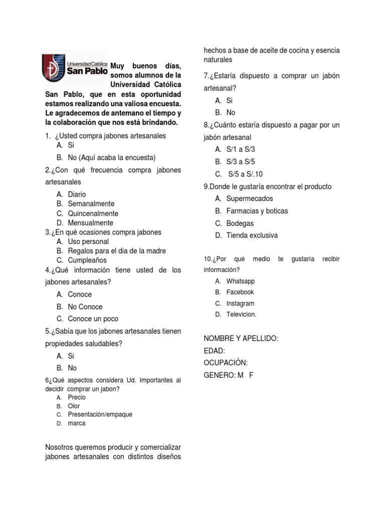 ¿qué atributos son importantes para este producto?¿qué beneficios adicionales tiene este producto para que usted lo prefiera? Huamanga facultad de ciencias econmicas, administrativas y contables escuela de formacin profesional de economa encuesta acerca del grado de aceptacin de un jabn de glicerina con aroma y diseo a frutas. Guardar guardar encuesta de jabon artesanal para más tarde.