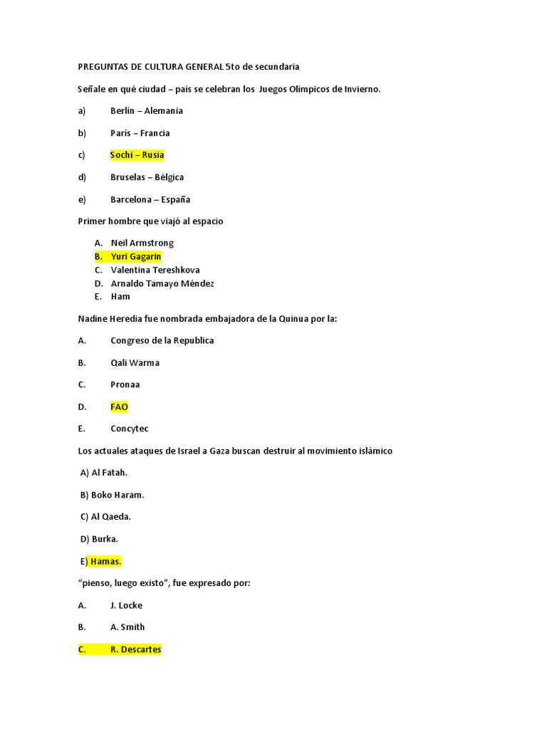 Preguntas De Cultura General 5To De Secundaria | Pdf | Papa