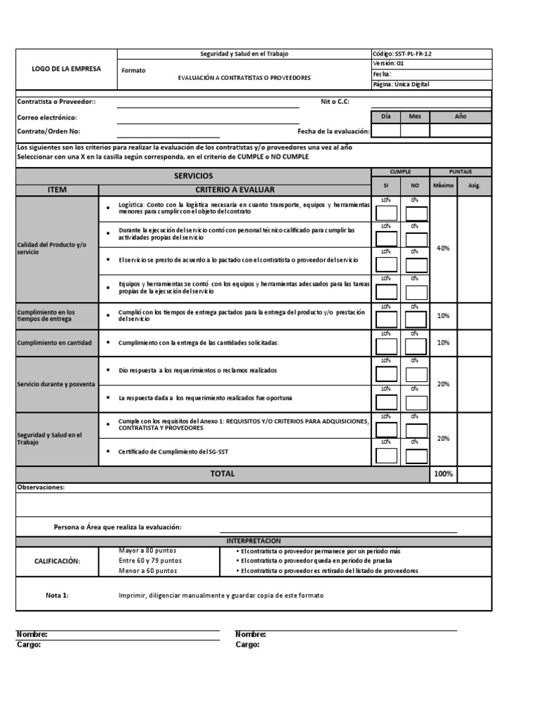 Instructivo para diligenciar el formato de evaluación de contratistas y proveedores campo a diligenciar definición contratista o proveedor: Imprimir y guardar copia de este formato. El proveedor requiere periodo de prueba para tomar una decisión.