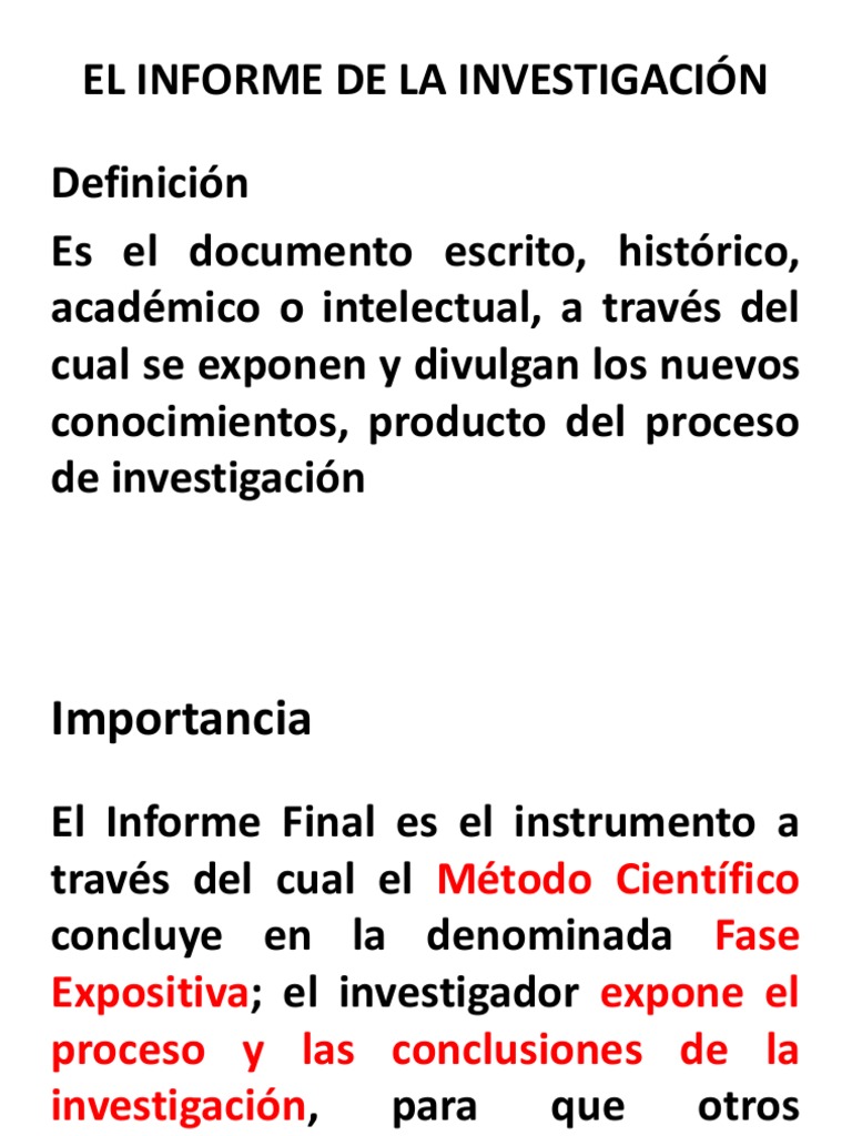La investigación científicaes un proceso dinámico que se caracteriza por ser riguroso y por conducir a la adquisición de nuevos conocimientos. Un informe de investigación es un documento escrito, realizado por el estudiante investigador en el cual se describen los resultados de su investigación. Es un registro sucinto del estudio de investigación efectuado por un especialista en el tema.