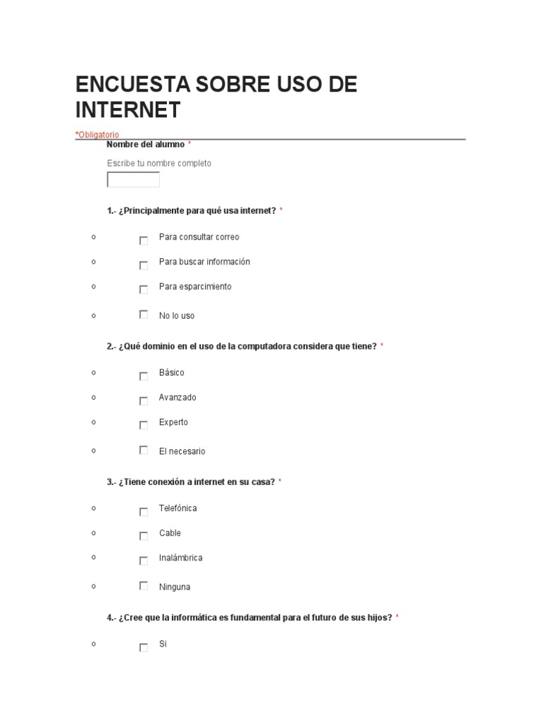 Una entrevista en línea es un método de investigación en línea. 10 preguntas sobre el mal uso del internet. No fue sino en 1983 que se adoptaron o fi cialmente para su utilización los protocolos de internet.